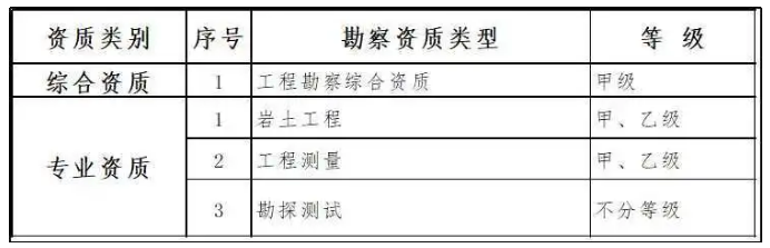 保留綜合資質(zhì)。將4類專業(yè)資質(zhì)及勘察勞務(wù)資質(zhì)整合為巖土工程、工程測量、勘探測試等3類專業(yè)資質(zhì)。專業(yè)資質(zhì)等級壓減為甲、乙兩級(勘探測試專業(yè)資質(zhì)不分等級),原丙級資質(zhì)并入相應(yīng)專業(yè)乙級資質(zhì)。