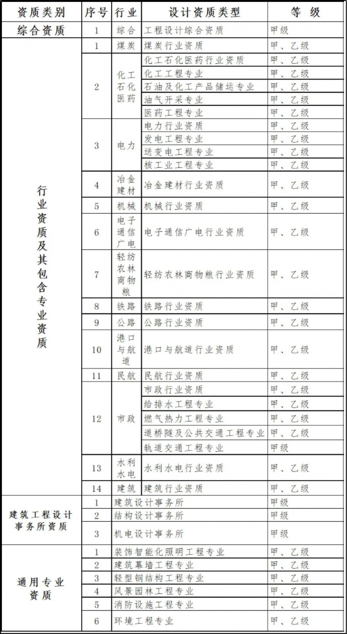 保留綜合資質(zhì)。對部分行業(yè)資質(zhì)進(jìn)行整合,其中,冶金行業(yè)與建材行業(yè)合并為冶金建材行業(yè)資質(zhì),輕紡行業(yè)、農(nóng)林行業(yè)、商物糧行業(yè)合并為輕紡農(nóng)林商物糧行業(yè),電子行業(yè)、通信行業(yè)、廣電行業(yè)合并為電子通信廣電行業(yè),石油天然氣行業(yè)并入化工石化醫(yī)藥行業(yè),軍工行業(yè)并入機(jī)械行業(yè),核工業(yè)行業(yè)并入電力行業(yè),資質(zhì)等級壓減為甲、乙兩級,原丙級資質(zhì)并入相應(yīng)行業(yè)乙級資質(zhì)。取消海洋行業(yè)及專業(yè)資質(zhì),相關(guān)企業(yè)可以換發(fā)相近行業(yè)資質(zhì)。整合原化工石化醫(yī)藥、石油天然氣、電力、市政行業(yè)中的專業(yè)資質(zhì),資質(zhì)等級壓減為甲、乙兩級,原丙級資質(zhì)并入相應(yīng)專業(yè)乙級資質(zhì);取消其他行業(yè)的專業(yè)資質(zhì),并入相應(yīng)行業(yè)資質(zhì),原甲、乙級專業(yè)資質(zhì)并入相應(yīng)等級的行業(yè)資質(zhì),原丙級專業(yè)資質(zhì)并入乙級行業(yè)資質(zhì)。將專項資質(zhì)調(diào)整為通用專業(yè)資質(zhì),取消環(huán)境工程專項資質(zhì)的5個專項類別,整合為環(huán)境工程專業(yè)資質(zhì),資質(zhì)等級壓減為甲、乙兩級,原丙級資質(zhì)并入相應(yīng)專業(yè)乙級資質(zhì)。保留3類事務(wù)所資質(zhì)。新3.jpg