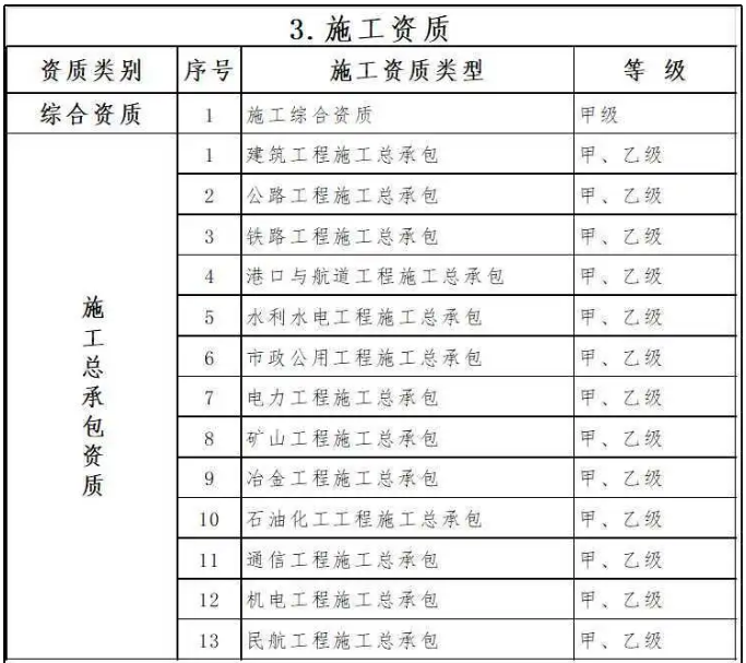 將施工總承包特級資質(zhì)調(diào)整為施工綜合資質(zhì),取得原10類施工總承包特級資質(zhì)中的任一類,即可換發(fā)綜合資質(zhì)。取得綜合資質(zhì)的企業(yè),可承擔(dān)各類別、各等級施工總承包業(yè)務(wù),不再申請或持有其他施工資質(zhì)。