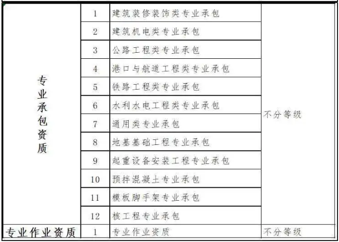 保留地基基礎(chǔ)工程、起重設(shè)備安裝工程、核工程等專業(yè)承包資質(zhì);將原專業(yè)承包資質(zhì)整合為建筑裝修裝飾類、建筑機(jī)電類、公路工程類、港口與航道工程類、鐵路工程類、水利水電工程類、通用類專業(yè)承包資質(zhì);專業(yè)承包資質(zhì)不分等級。